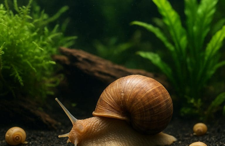 - Podłoże i kryjówki — gładkie kamienie, korzenie i rośliny to miejsca, gdzie ślimaki lubią się przemieszczać i składać jaja. Zapewnij różnorodne powierzchnie.