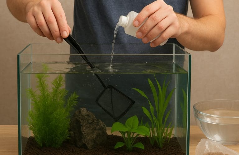- Wymień maksymalnie 20–30% wody przed wpuszczeniem — świeża woda powinna być odchlorowana i dopasowana temperaturą.