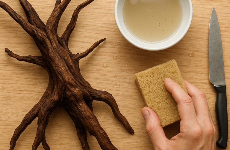 Oczyszczanie korzenia to obowiązkowy etap. Nawet korzeń zakupiony w sklepie wymaga przygotowania, aby usunąć brud, piasek, resztki kory i ewentualne szkodniki.