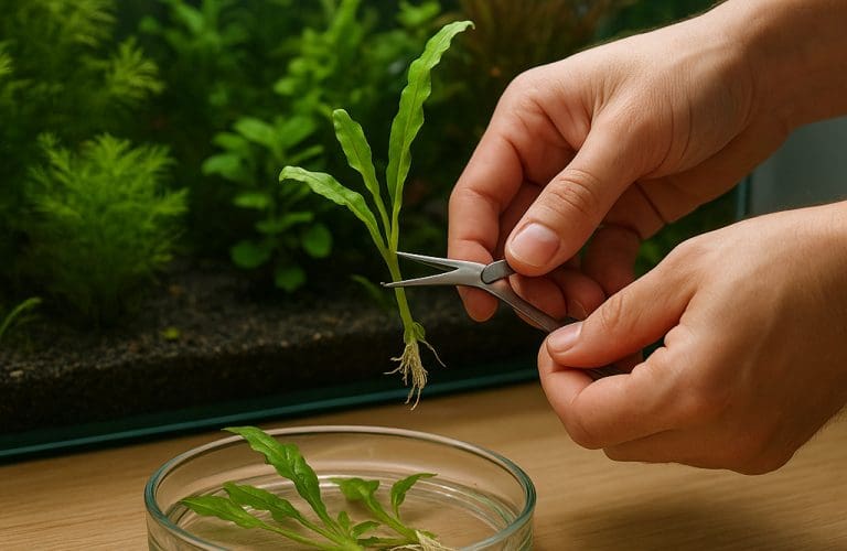- Podział — dzielimy rośliny kępkowe, takie jak Echinodorus czy Cryptocoryne, na mniejsze części z korzeniami.