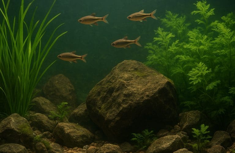 - Pozostaw miejsca pływowe i kryjówki — ryby potrzebują przestrzeni do pływania i ukrycia.