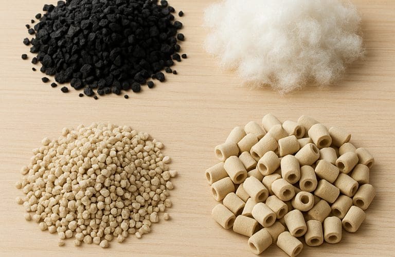 - Łączenie mediów: typowy układ to warstwa mechanicza (wata/włóknina/gąbka), następnie warstwa biologiczna (keramzyt, biokulki), a opcjonalnie na końcu warstwa chemiczna (węgiel, zeolit) stosowana doraźnie.